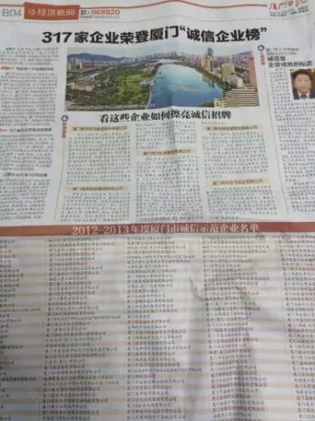 由廈門市誠信促進(jìn)會及相關(guān)職能部門聯(lián)合開展的“2012—2013年度廈門市誠信示范企業(yè)”評選結(jié)果日前出爐,今天,廈門國貿(mào)與其它摘得金牌的316家標(biāo)桿企業(yè)一起接受了表彰。