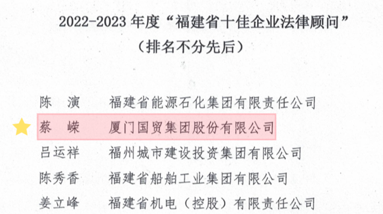 國(guó)貿(mào)股份榮獲“2022-2023年度福建省企業(yè)法治工作先進(jìn)單位”“十佳法律顧問(wèn)”等兩項(xiàng)稱號(hào)。