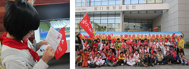 2011年10月,廈門國(guó)貿(mào)集團(tuán)“愛與夢(mèng)飛翔”志愿者帶領(lǐng)廈門市文安小學(xué)學(xué)生參觀廈門規(guī)劃展覽館。在規(guī)劃展講解員的帶領(lǐng)下,學(xué)生們親身感受了廈門的發(fā)展,體驗(yàn)有趣的環(huán)形影院和各式各樣的最新科技,實(shí)實(shí)在在的了解了每天生活的城市,通過感受特區(qū)發(fā)展,也加深了他們對(duì)生活的熱愛,激勵(lì)學(xué)生懷抱建設(shè)家園的夢(mèng)想,積極向上。