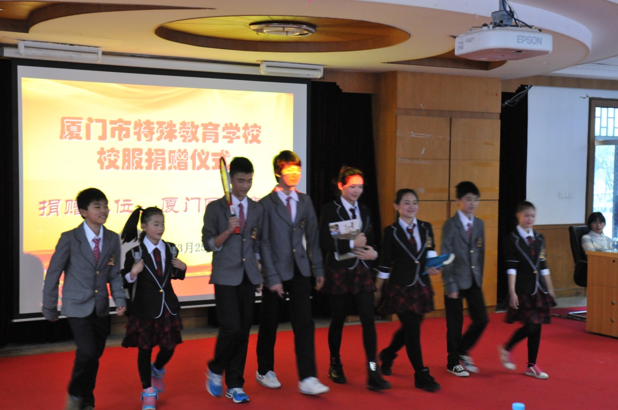 3月25日,廈門(mén)國(guó)貿(mào)愛(ài)心捐贈(zèng)儀式在廈門(mén)特教學(xué)校舉行。國(guó)貿(mào)300多名黨員自愿捐款,為廈門(mén)特教學(xué)校全體學(xué)生制作一套校服。