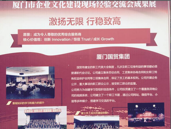 今天,市委宣傳部召開2013-2015年廈門市企業(yè)文化建設(shè)工作經(jīng)驗(yàn)交流會(huì)。我司《推進(jìn)“三大”建設(shè),踐行社會(huì)主義核心價(jià)值觀》的做法在會(huì)議交流,并在全市企業(yè)文化建設(shè)成果展顯著位置展示。我司和國(guó)貿(mào)控股公司一起被評(píng)為2013-2015年廈門市企業(yè)文化建設(shè)示范單位。