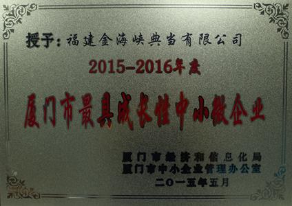 2015年5月,福建金海峽融資擔(dān)保有限公司、福建金海峽典當(dāng)有限公司分別獲得廈門市經(jīng)濟(jì)和信息化局和廈門市中小企業(yè)管理辦公室共同授予的“2015-2016年度廈門市最具成長性中小微企業(yè)”的稱號。
