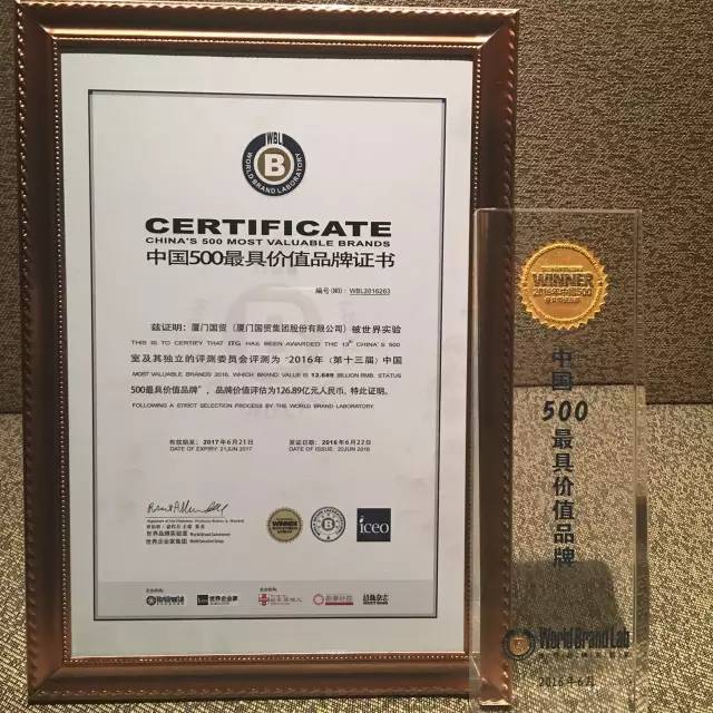 6月22日,在世界品牌實驗室主辦的“世界品牌大會”上發(fā)布了2016年(第十三屆)《中國500最具價值品牌》排行榜。在這份基于財務(wù)、消費者行為和品牌強度分析而獲得的中國品牌國家隊陣容中,廈門國貿(mào)以126.89億元的品牌價值位居本年度最具價值品牌第263位,公司品牌價值首次超過了百億元。