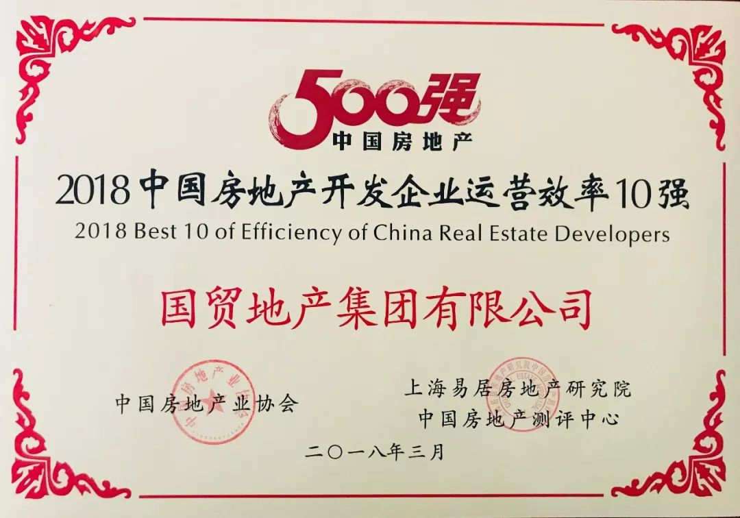 2018年3月21日,由中國房地產(chǎn)業(yè)協(xié)會、中國房地產(chǎn)測評中心聯(lián)合開展的“2018中國房地產(chǎn)開發(fā)企業(yè)500強測評成果發(fā)布會”在北京召開,國貿(mào)地產(chǎn)集團在此次測評中再次榮登中國房地產(chǎn)開發(fā)企業(yè)100強(位列第88名),并榮獲2018中國房地產(chǎn)開發(fā)企業(yè)運營效率10強第6位。