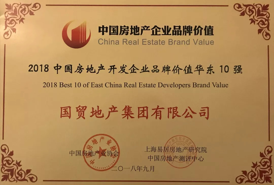 喜報丨國貿地產榮獲2018中國房地產品牌價值測評華東10強