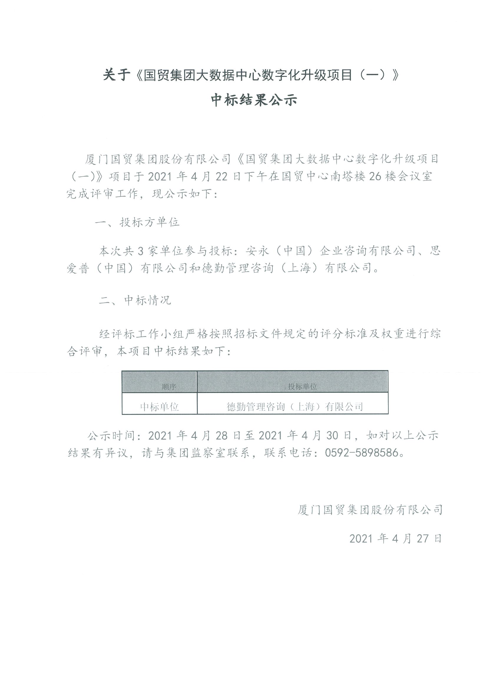 關(guān)于《國貿(mào)集團(tuán)大數(shù)據(jù)中心數(shù)字化升級項目(一)》采購中標(biāo)結(jié)果公示