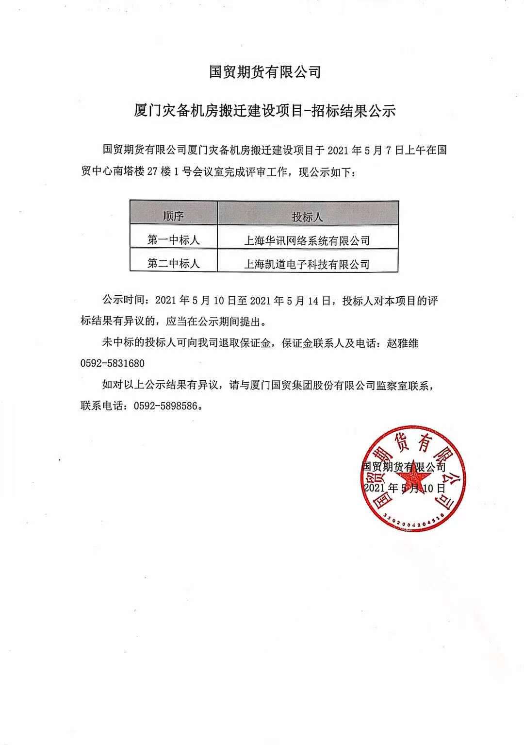 國貿期貨廈門災備機房搬遷建設項目招標結果公示