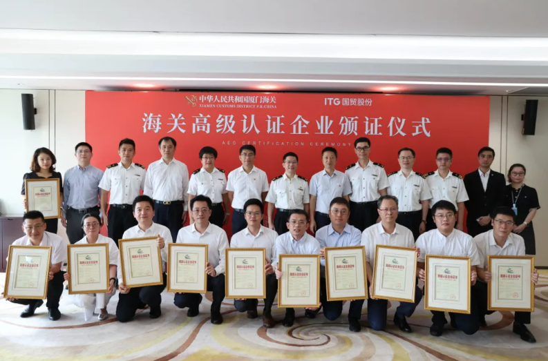 廈門海關(guān)為國貿(mào)股份進(jìn)行集體頒證,標(biāo)志著國貿(mào)股份旗下11家子公司順利通過海關(guān)高級認(rèn)證,成為AEO企業(yè)。