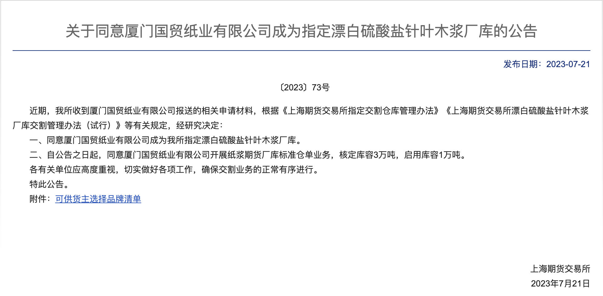 國貿紙業(yè)成功獲批漂白硫酸鹽針葉木漿廠庫資質,該資質為國貿股份于上期所取得的首個期貨交割庫資質。