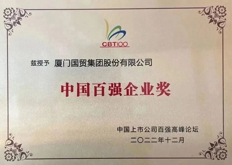 廈門國貿(mào)集團股份有限公司(股票代碼:600755.SH)榮獲“2022年中國上市公司百強企業(yè)獎”。