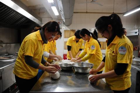 本次比賽吸引了眾多美食愛好者參加,他們分成兩隊,一隊跟隨特教學(xué)校的老師和學(xué)生學(xué)習(xí)制作比薩、蛋糕、餅干等西點,另一隊跟隨國貿(mào)集團烹飪俱樂部的“老師”學(xué)習(xí)制作四喜餃子、水晶餃等中式點心。特教學(xué)校和國貿(mào)集團的“老師”們分別介紹了制作要點后,大家就開始分頭動手制作各式美食了。
