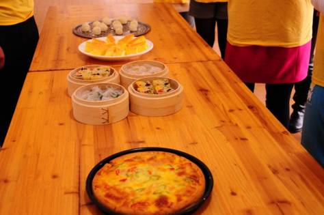 到了實踐環(huán)節(jié),學(xué)員們個個躍躍欲試,一開始粗糙的技術(shù)隨著練習(xí)不斷地進步,雖然無法與老師們比肩,也算是有模有樣。不一會兒,餃子和包子便上籠開蒸,烤箱里傳出蛋糕、餅干和披薩的香味,令人垂涎欲滴。